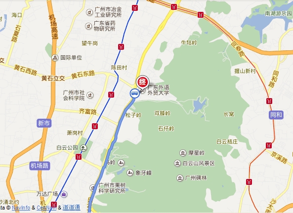 换乘公交864路,到达外语学院白云山西门站,过斑马线,到达广外西门;