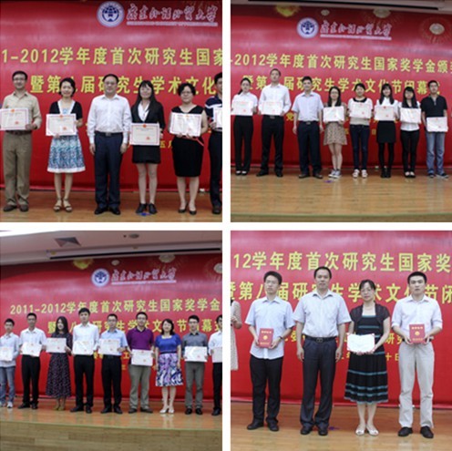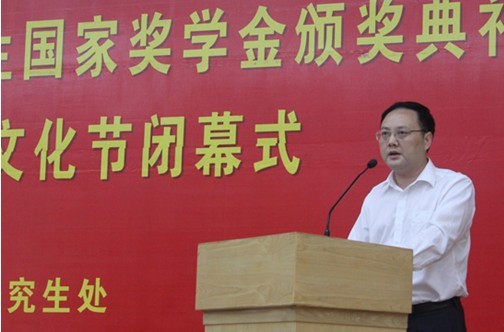 5月30日,2011—2012学年度首次研究生国家奖学金颁奖典礼暨第八届研究生学术文化节闭幕式在北校区图书馆报告厅举行。副校长石佑启、研究生处处长袁泉、研究生工作部部长康为茂、研究生处副处长朱文忠及各研究生培养单位的领导、老师、研究生参加了活动。