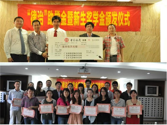 2012年11月1日下午,法律硕士教育中心“律治”助学金暨新生奖学金颁发仪式在北校区第九教学楼顺利举行。广东国鼎律师事务所朱列玉主任、广东卓凡律师事务所杨择郡主任、广东岭南律师事务所李栋律师及法学院院长蔡镇顺教授、副院长龙著华教授、叶昌富老师、宁少媛老师以及等出席了颁发仪式,常廷彬教授主持此颁发仪式。