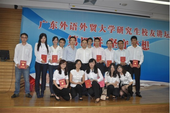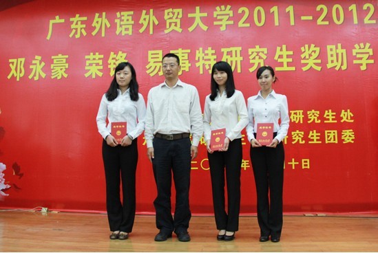 研究生处副处长朱文忠宣读表彰决定后,邓永豪、石佑启等为“邓永豪研究生奖学金”获得者颁奖。“邓永豪研究生奖学金”获奖代表林江豪在发言中说,研究生奖学金是他不断创新和追求卓越的动力。他用“幸福”二个字形容自己的大学,并表示广外让他找到自我、找到信心,让他从一个农村孩子变为拥有多项学术成果的复合型人才。最后,他感谢广外为他提供了多彩的舞台,感谢资助企业对他的鼓励。