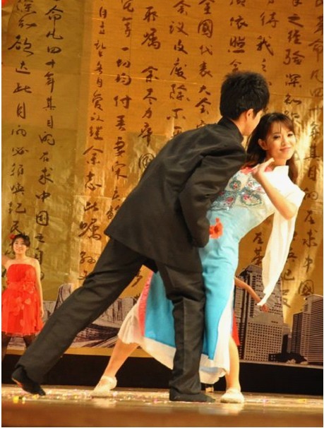 10法四的舞台剧《爱在战火纷飞时》则综合演唱与舞蹈,在以“战乱之恨”、“思念之切”、“泪雨之痛”等为主题的几幕中巧妙地插入经典歌曲作为背景,演绎了战争时代一段凄美动人的爱情故事。整个场面情意绵绵,感人至深,有不少同学禁不住湿了眼眶,为剧中的悲情发出感慨。一落幕,全场掌声雷动,观众激动地欢呼鼓掌,将晚会带入了一个高潮。
