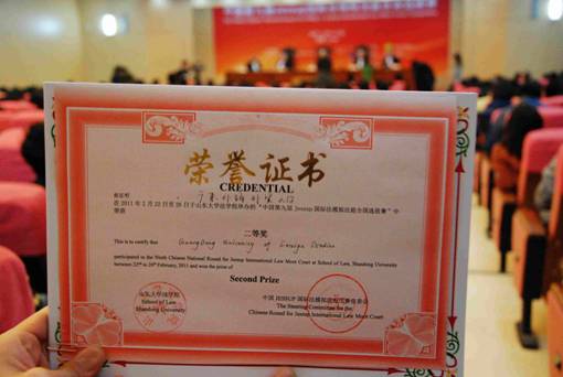 2011年2月22至2月26日,第九届Jessup国际法模拟法庭中国选拔赛在山东大学法学院隆重举行。本次比赛有包括人民大学、武汉大学、厦门大学等39所学校派代表队参赛,是历届比赛中规模最大的一届。应邀担任此次模拟法庭比赛的法官多数是来自美国、英国、法国等国家的著名国际法领域专家、学者、律师和法官。经过4天的激烈角逐,人民大学捧得比赛桂冠,我校代表队取得全国二等奖的好成绩。