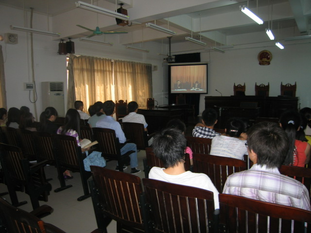 4月19日上午,南沙区基层法院在广东外语外贸大学法学院南校区模拟法庭现场开庭审理易建波故意杀人一案。由于法硕学生在北校区上课,不能到现场旁听,法硕中心便组织同学们在六教的模拟法庭观看庭审的现场直播。