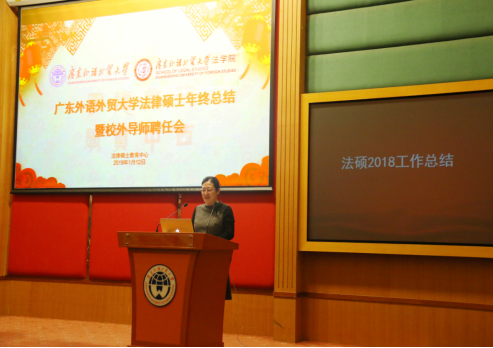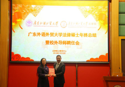 1月12日下午,广东外语外贸大学法律硕士年终总结暨校外导师聘任会在北校区行政楼国际会议厅隆重举行。广东外语外贸大学校长、党委副书记石佑启,法学院党政班子成员,法律硕士教育中心主任杨桦出席大会。来自各级人民法院、检察院、律师事务所等法律实务界的校外实践导师代表、法律硕士校内导师代表和法律硕士研究生代表参加大会。大会由法学院副院长韩永红主持。