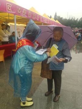 上午10时许,活动正式开始。该次活动规模壮大,嘉宾阵容鼎盛,各方媒体也纷纷前来拍摄报道。活动内容包括了就业创业、生活保健、计划生育、远离毒品、社会保障、事务纠纷、法律问题等方面的咨询。尽管当天清晨下过雷阵暴雨,活动现场也伴着细雨,但人流量仍然大,有不少群众前来观望和求助,现场气氛相当活跃。分属法援、团学的九位志愿者纷纷披上雨衣,戴上志愿者授带,在各个摊位前穿梭,派发法援宣传单和就业服务活动的相关资料,热情接待到场的群众。志愿者们耐心引导,许多群众接受志愿者们的解说,按照指引到相应的摊位进项咨询。据志愿者的观察,以未成年人保护问题、与“家暴”等密切相关的家庭婚姻问题、妇女维权问题等为咨询内容的摊位最为吸引群众,可见,越来越多群众,特别是妇女群体,已经开始了解法律,学习法律,慢慢懂得运用法律来维护自身权益。