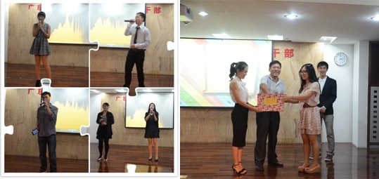 晚会接近尾声的时候,小可爱杨阳,大陆歌手张琳分别登台为大家演唱了《可爱颂》与《剪爱》。13级梁一蔚同学为大家倾情演唱《K歌之王》,文艺厅内掌声如雷,空气中弥漫着欢乐的味道。紧接着,12级罗旋师哥为大家带来一首《我的歌声里》,在同学们浪潮般的“安可”声中,罗师哥又献上一曲《如果没有你》,真可谓“此曲只应天上有,人间能得几回闻”。